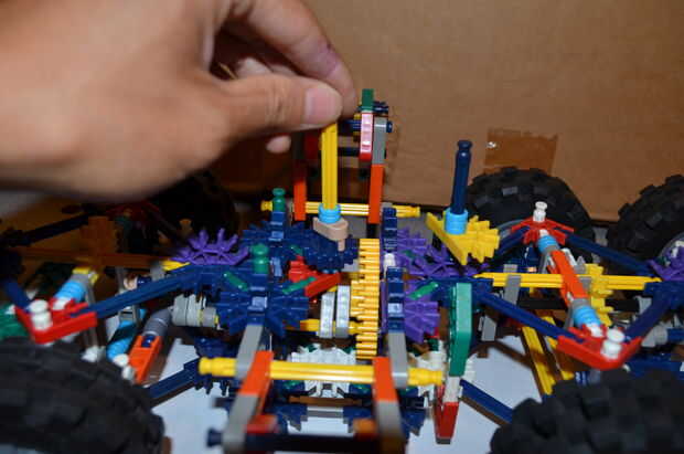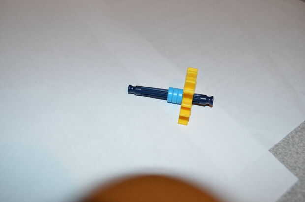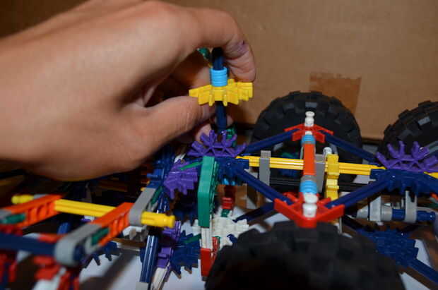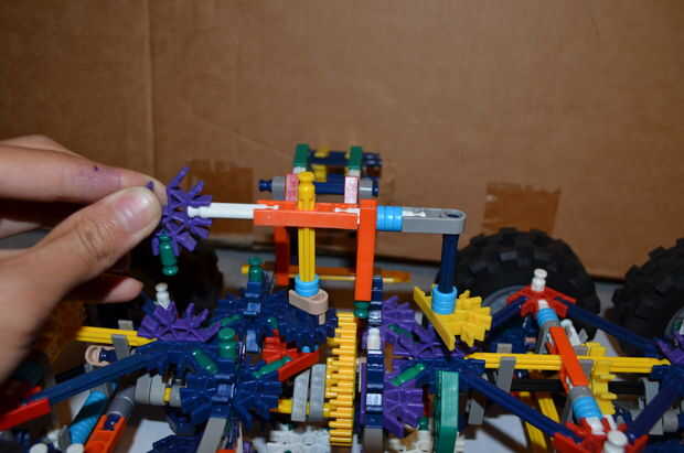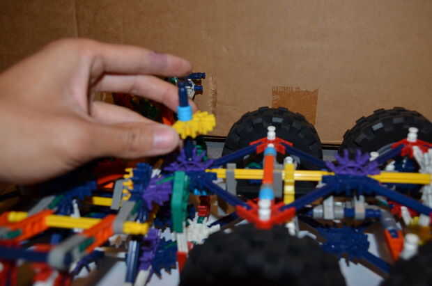 Here we put on the steering stick.  Puede sustituir la varilla amarilla por una más larga y colocar una rueda si quieres; Yo sólo nunca se molestaron con él ya que estaba más preocupado por crear una grúa de trabajo.  También, la palanca de dirección no hace un adecuado trabajo en el giro las ruedas (otra cosa a tener en cuenta para mi próximo diseño...), incluso los conectores sujeta en su lugar.