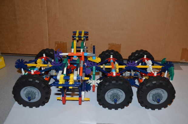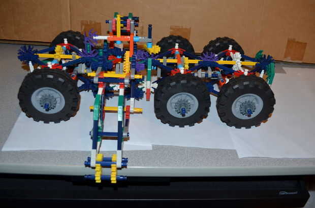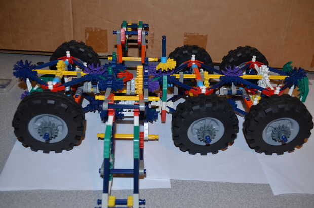 esto es una 4wd K'nex carro con puertas funcionales, un portón, acceso de baterías bajo el capó motor, un volante (dummy), cambio de marchas (dummy), asientos, llanta de repuesto y una cama. El sistema 4wd es rápidamente configurable para la impulsió