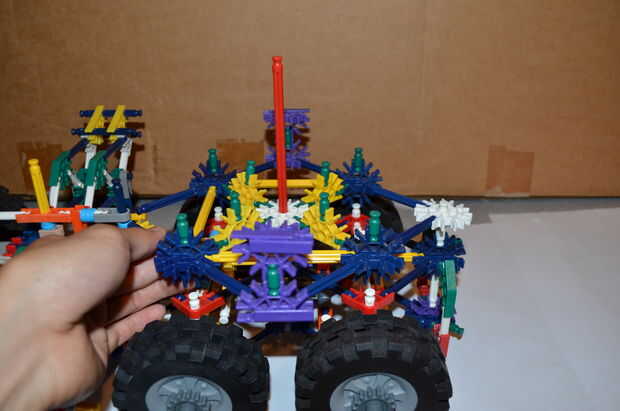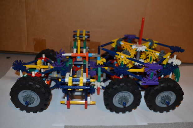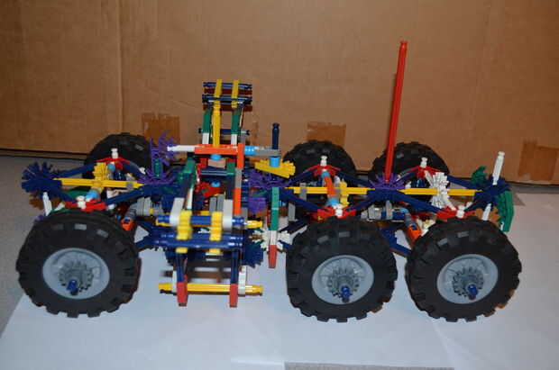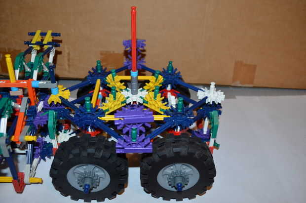 esto es una 4wd K'nex carro con puertas funcionales, un portón, acceso de baterías bajo el capó motor, un volante (dummy), cambio de marchas (dummy), asientos, llanta de repuesto y una cama. El sistema 4wd es rápidamente configurable para la impulsió