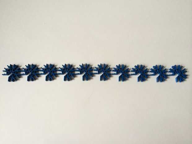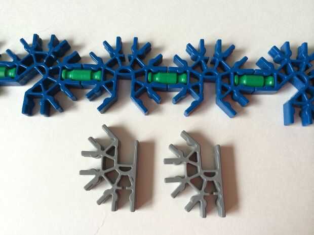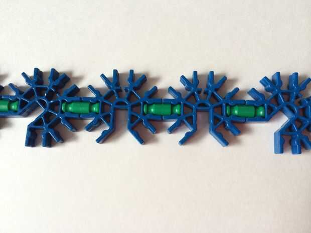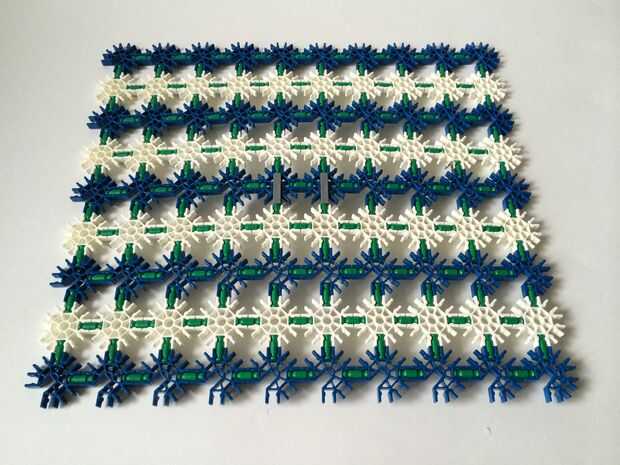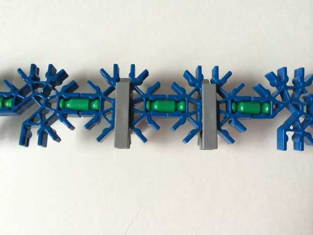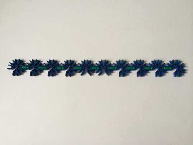 También tomar diez conectores azules y conectarlos con barras verdes. Asegúrese de que prueba se hacia la misma dirección como en la imagen! Repita el procedimiento para obtener cinco filas. Una fila debe tener los conectores del dos centro hacia abajo como se muestra. Añadir dos conectores gris a los dos conectores azul hacia abajo. Estos actuarán como apoyo en el centro del tablón de anuncios.