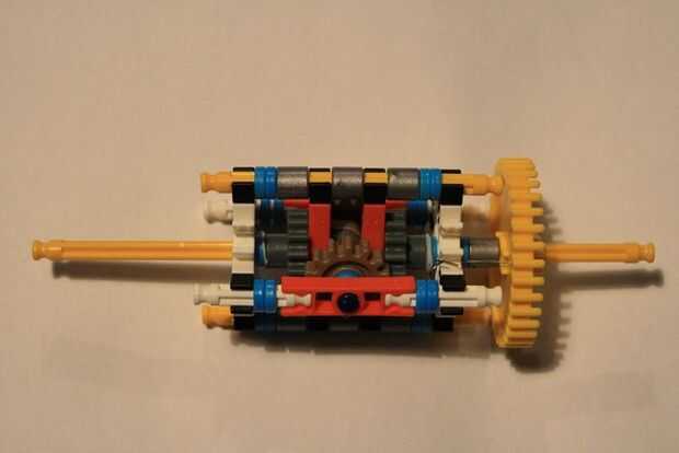 diferencial ha formado. No el más pequeño, pero aún fresco. Lista de partes: 4 engranajes de esquina, 1 engranaje Normal (o rincón) 1 engranaje grande, barras pequeñas de 36 negro/verde, 39 barras blancas, 9 barras rojo, barras amarillo 1, 1 barra la