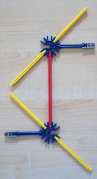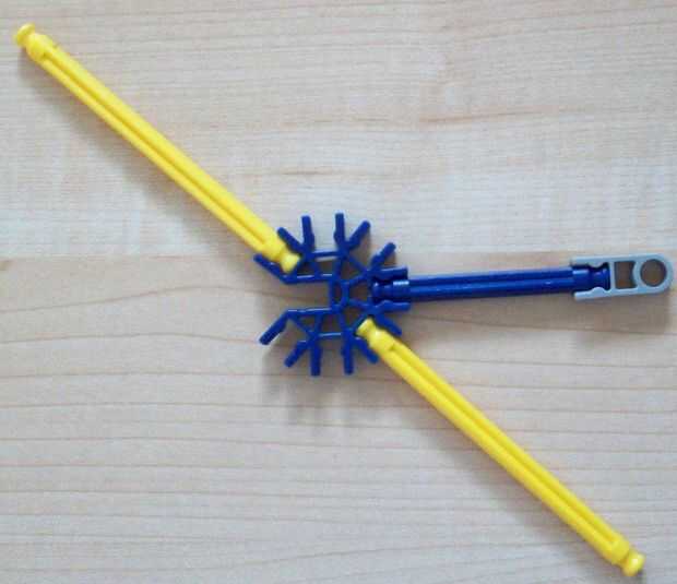 Así utilizamos conectores de cualquiera el tipo azul o blanco (suelen utilizar los azules como los que no ha utilizado todavía) y Coloque 2 varillas (amarillo) a ambos lados que, juntos, tienen la misma longitud de la barra diagonal (gris).