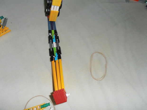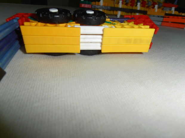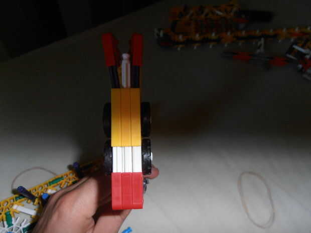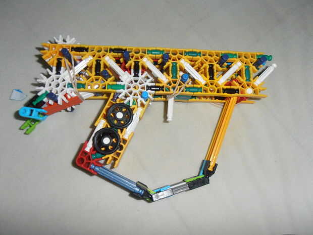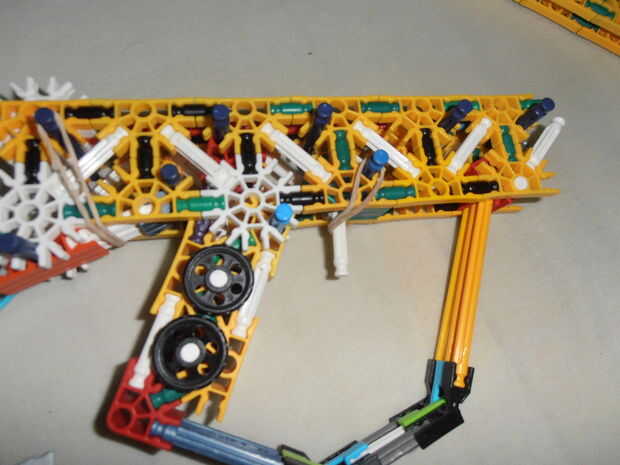 Hi i made this k'nex bulldozer , which has steering and a digging scoop. También tiene unas escaleras ubicadas en la parte trasera del vehículo. El manejo posterior es una gran idea porque ayuda a la topadora manejar mejor que un coche alrededor de l