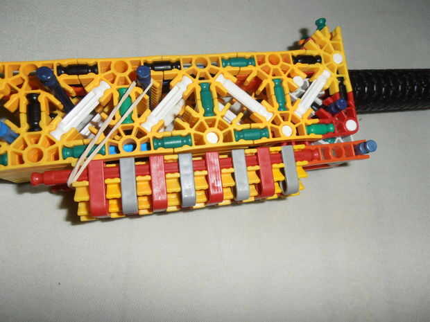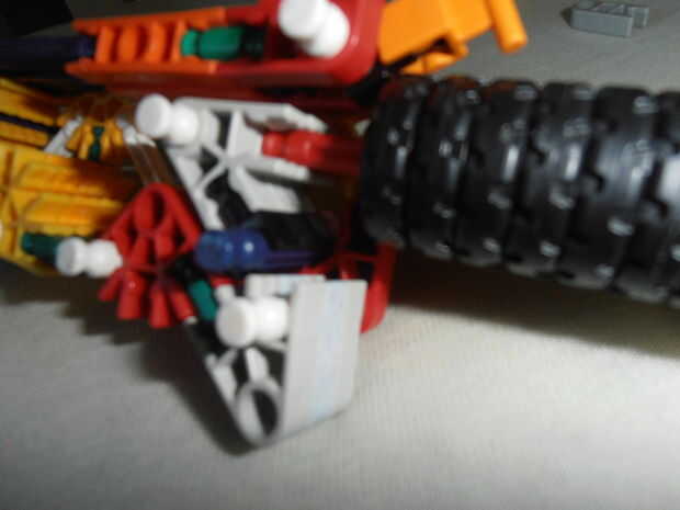 Hi i made this k'nex bulldozer , which has steering and a digging scoop. También tiene unas escaleras ubicadas en la parte trasera del vehículo. El manejo posterior es una gran idea porque ayuda a la topadora manejar mejor que un coche alrededor de l