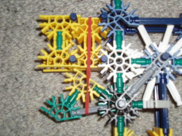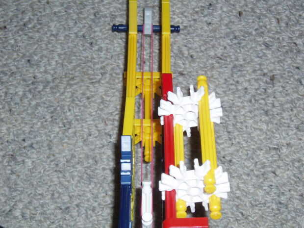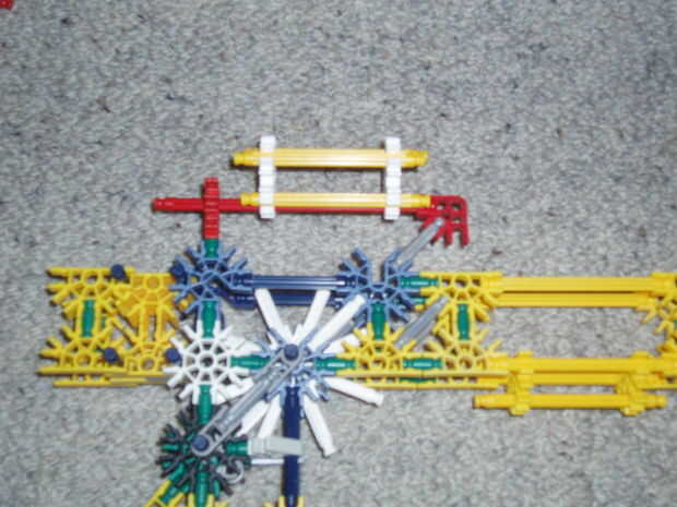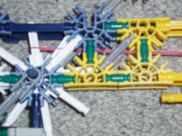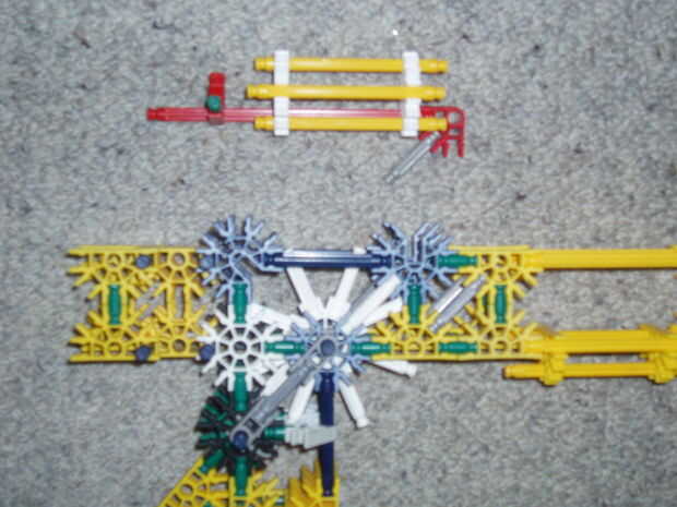 Hola, este es mi K'nex pistola, dispara balas de por lo menos 2 al mismo tiempo y tiene mucho poder. He intentado hacer la pistola más sólido de su forma original mediante el refuerzo de las piezas alrededor del gatillo con conectores escalera naranj
