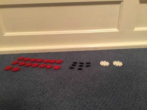 Para este explosivo progect necesita las piezas siguientes. Barras: 7 pequeño negro o verde. Conectores: 16 rojas, 2 blancas. Eso es todo!