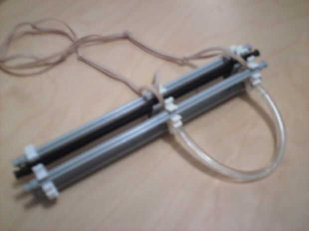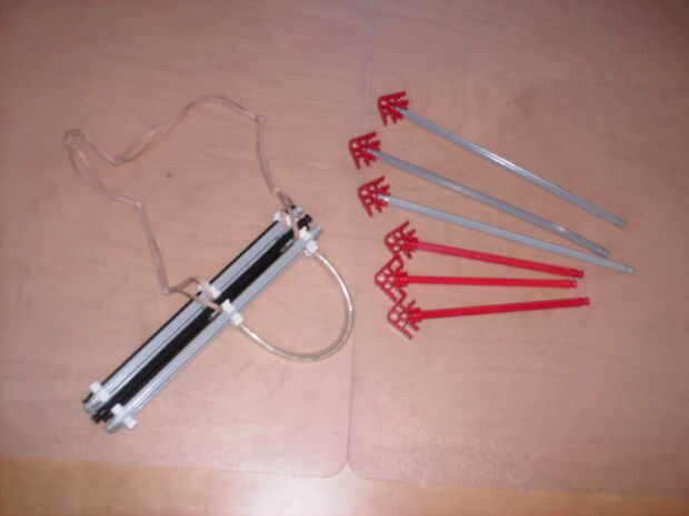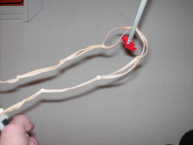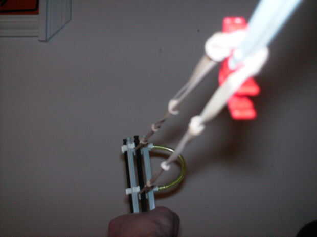 Además, la cadena de bandas de goma se coloca directamente en la barra de negro en la imagen. Los conectores gris son sólo existe para mantener las gomas en el lugar.