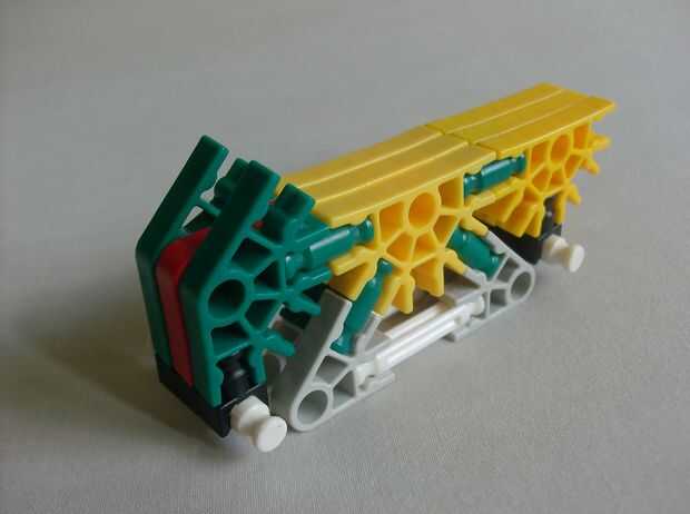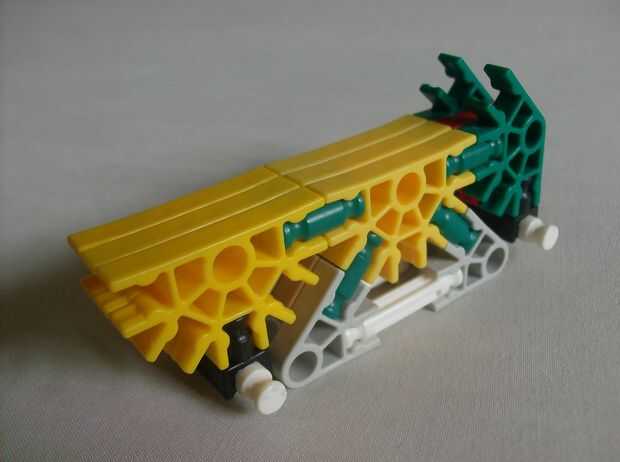 Hi i made this k'nex bulldozer , which has steering and a digging scoop. También tiene unas escaleras ubicadas en la parte trasera del vehículo. El manejo posterior es una gran idea porque ayuda a la topadora manejar mejor que un coche alrededor de l