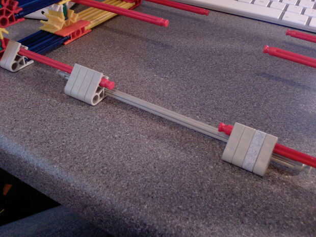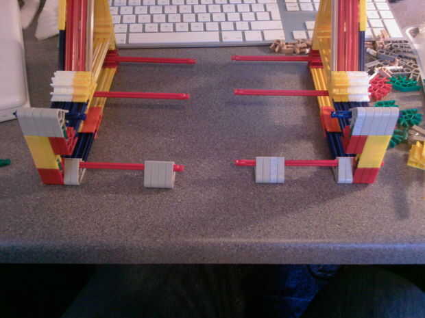 Lugar de los dos lados, al lado de uno. Comience agregando los 4 conectores gris a cada lado, como cuadro 1. Ahora se unen estas dos mitades junto con una varilla larga gris, como cuadro 2. Repita este paso para el regreso dos barras rojas, pero esta vez usando los conectadores de la esquina roja (esto ayuda a le derribo del uso de todos los conectores grises)