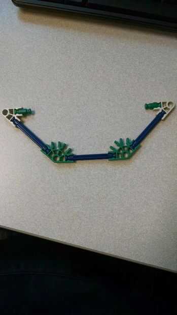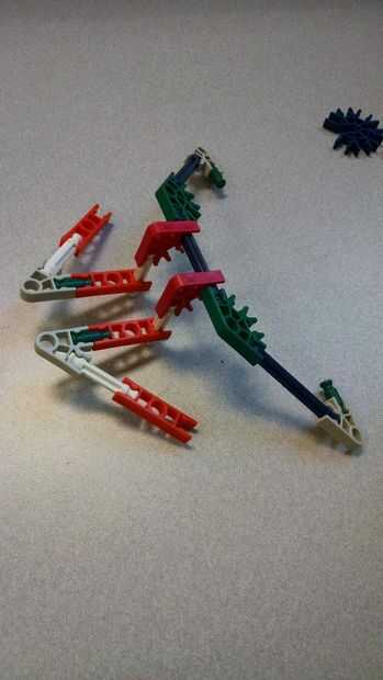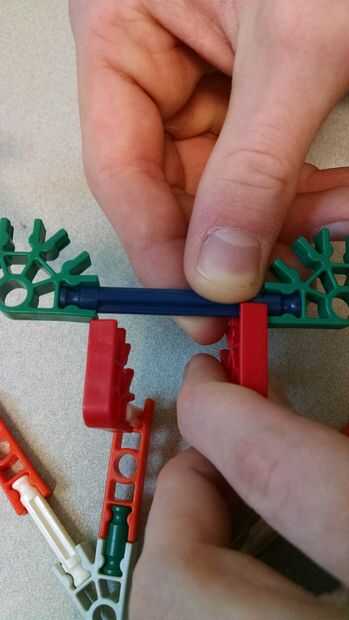 Usando la varilla del centro más azul en la pieza a fijar el justo hecho pedazo con las dos patas de biela a los dos conectores rojo utilizando la ranura perpendicular al agujero en el conector rojo