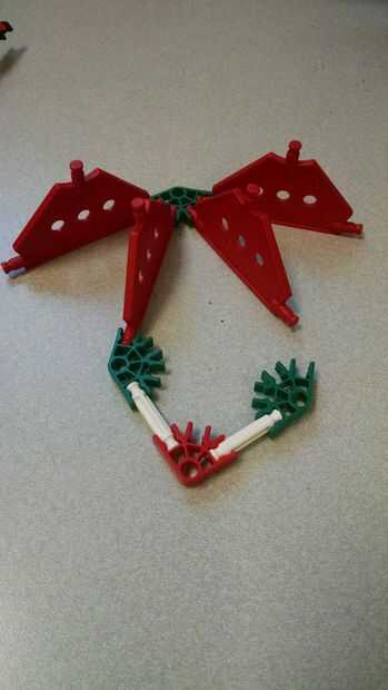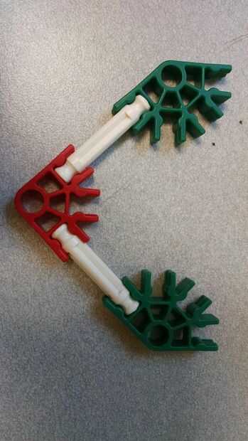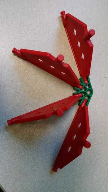Coloque un panel triangular rojo para cada ranura en un conector verde con paneles triangulares perpendiculares a la pieza de verde como se muestra en la imagen