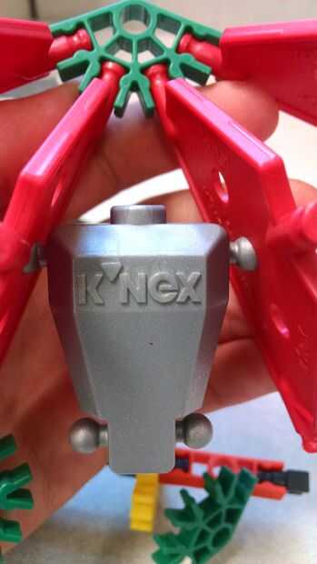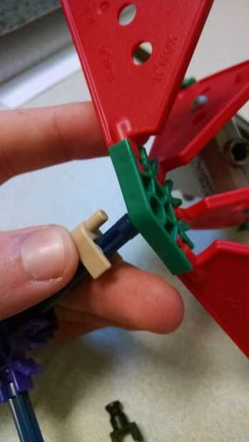 Deslice las dos interiores panel triangular rojo sobre las articulaciones de rótula superior del cuerpo gris usando los orificios (será suelto antes de conectar con el conector verde)