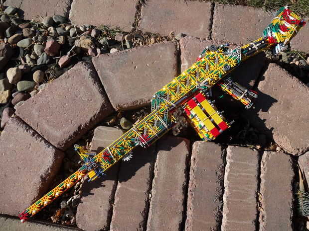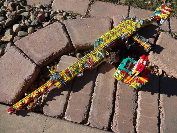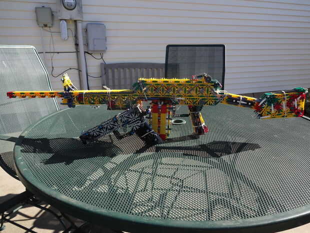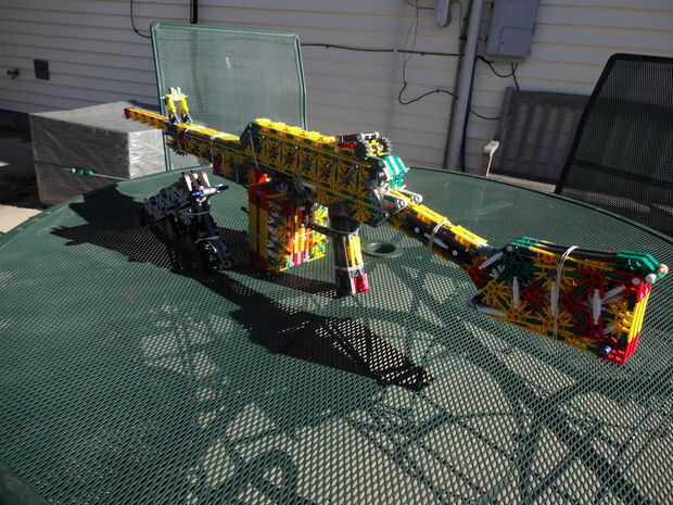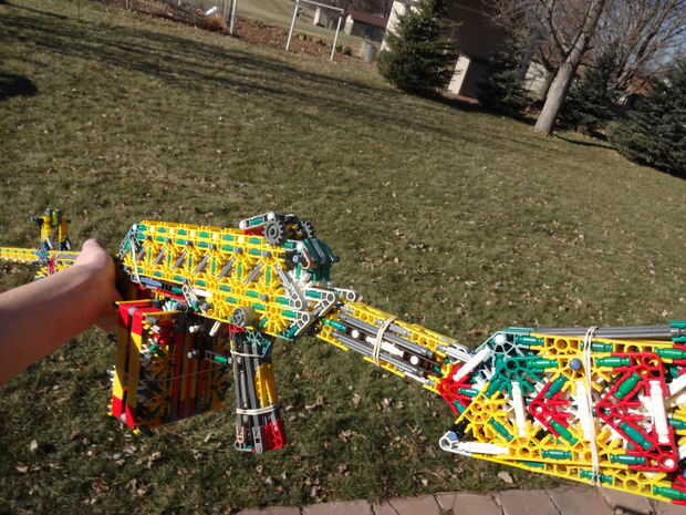 se trata de una sierra de K'nex que hice. Se ve cool y tiene un motor de cuerda para hacerlo funcionar. También tiene un clip de correa para fácil transporte y una cerradura para poder enrollar con antelación y transportarlo fácilmente. Perfecto para