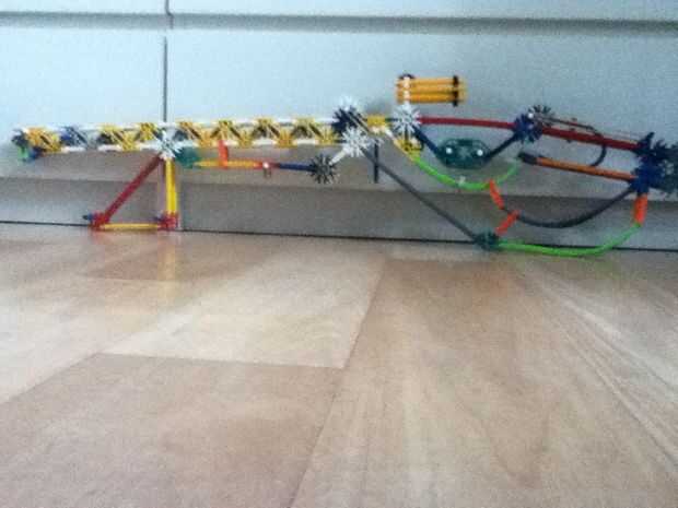 Hi i made this k'nex bulldozer , which has steering and a digging scoop. También tiene unas escaleras ubicadas en la parte trasera del vehículo. El manejo posterior es una gran idea porque ayuda a la topadora manejar mejor que un coche alrededor de l