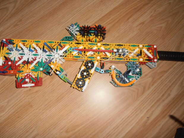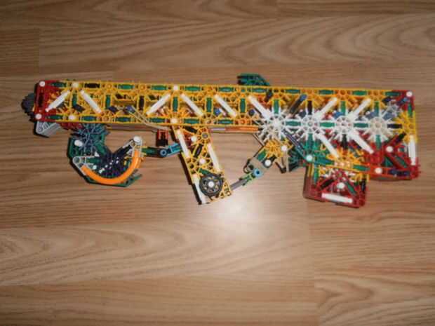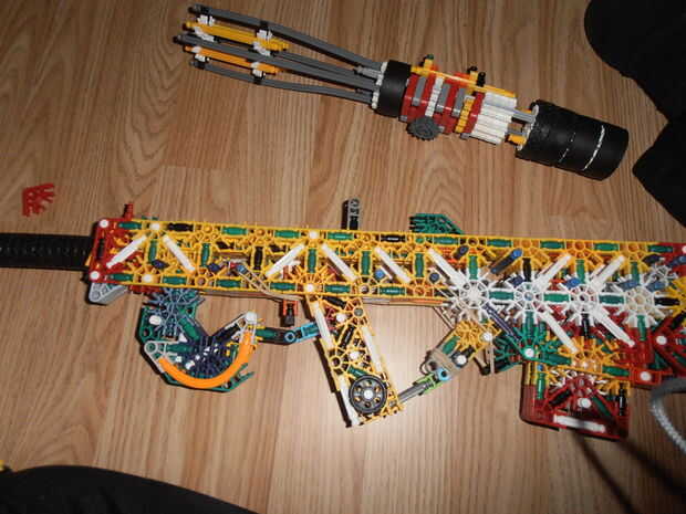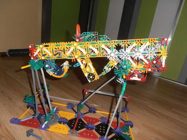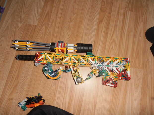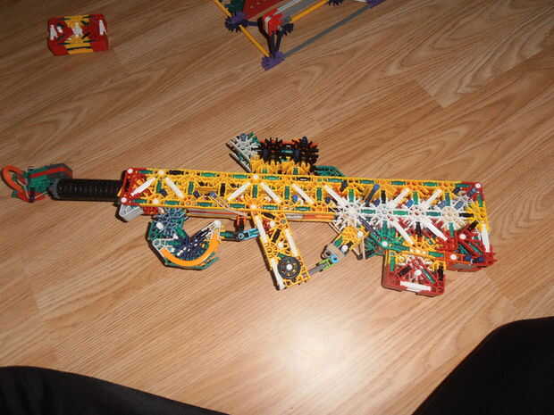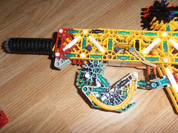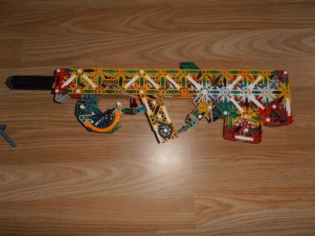 Créditos: KnexBuild.Tira 25 pies con dos bandas.La revista tiene 6 balas.Compartimiento extraíble.KnexBuild mecanismo de pasador de la barra.Gatillo de verdad reforzado.Trabajo diseño de cachorro de bull.Muy grande.Listo el carril.