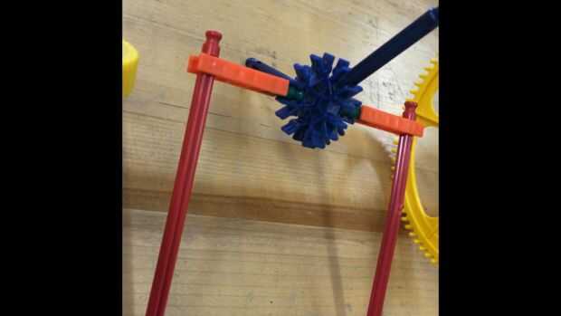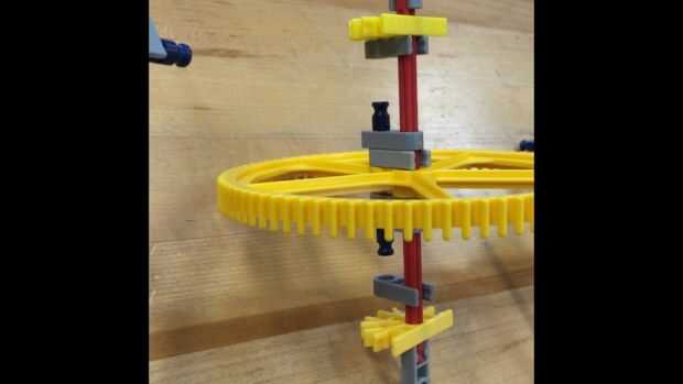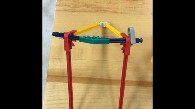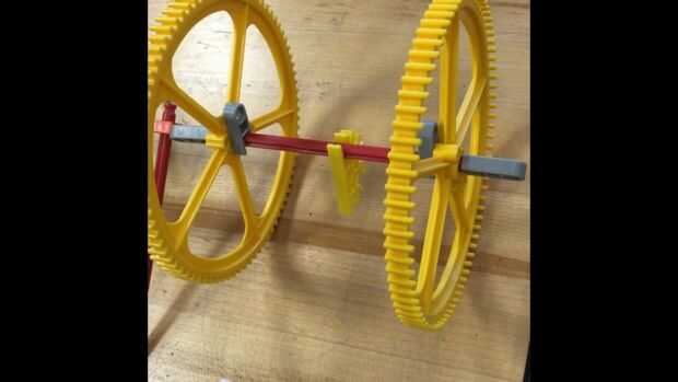 Esta parte requiere de dos ruedas, una barra roja, una pieza conjunta amarillo y cuatro piezas de tapón gris. Coloque y fije como se muestra