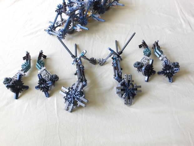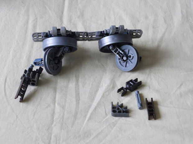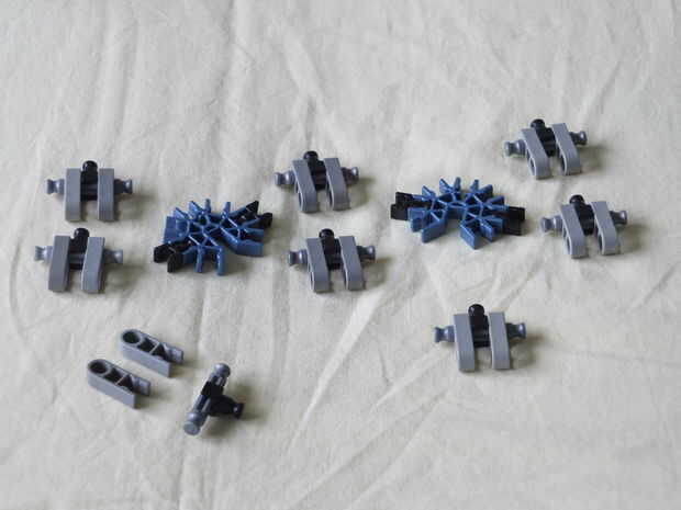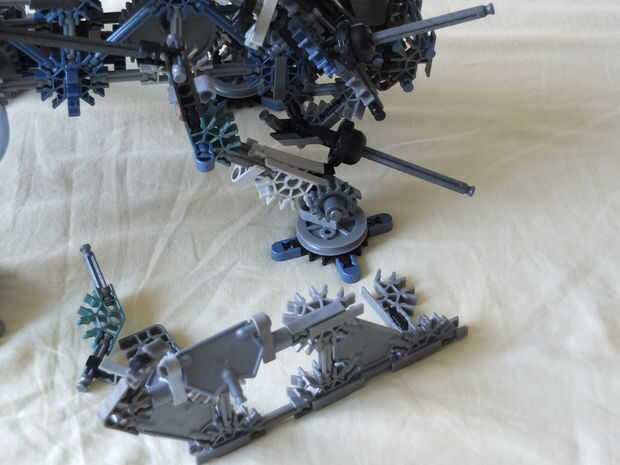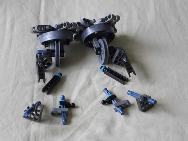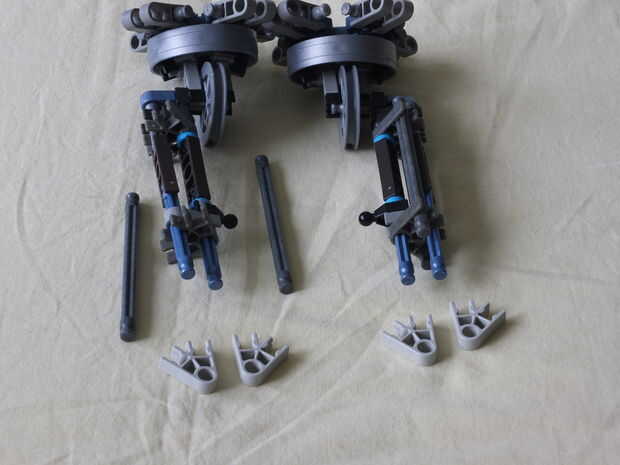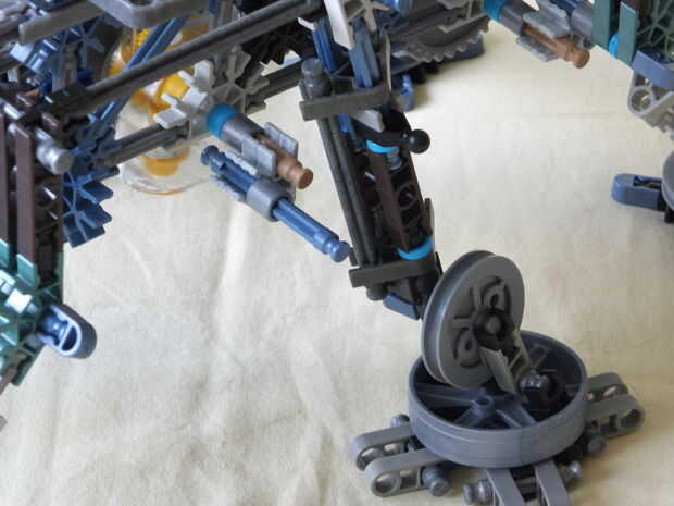 Los pies me dieron el boundairies a lo grande sería el modelo. Las patas medias son un poco más grandes, y resolví tener conector gris clips como los dedos del pie y del eje de una rueda como centro esférico. Las articulaciones blindadas típicas son hechas por otro conjunto de ejes de rueda.