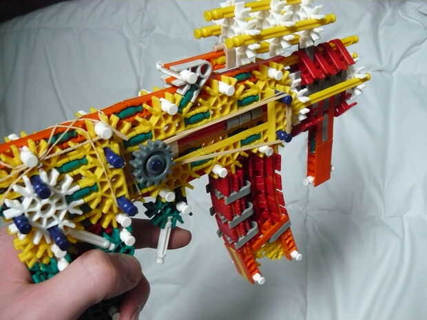 nuestro k'nex mejor arma todavía porque bueno para k'nex guerras.alto daño porque dispara barras amarillas.Cuando se modifica algo por favor nos dicen porque tal vez pueda entrar en los pasosPros:verdadero gatilloalcance de élitecómoda bolsaseguridad