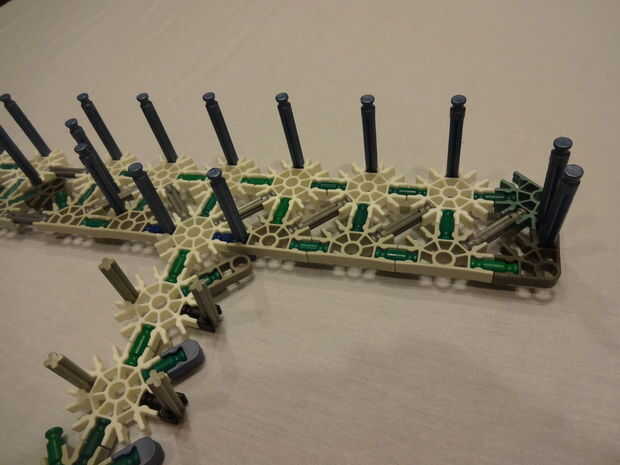 este k'nex reloj funciona totalmente sin la potencia de los motores pero utiliza un peso para la energía. El escape puede trabajar durante aproximadamente una hora antes de que el peso debe ser levantado otra vez pero con algunos ajustes que sería fá