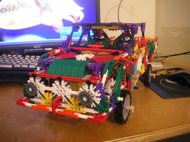 esto es una 4wd K'nex carro con puertas funcionales, un portón, acceso de baterías bajo el capó motor, un volante (dummy), cambio de marchas (dummy), asientos, llanta de repuesto y una cama. El sistema 4wd es rápidamente configurable para la impulsión de rueda delantera/posterior solamente.