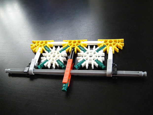 Deslice un extremo de la barra gris en la esquina roja a un lado, luego el otro, al tiempo que garantiza la parada verde en la nota 1 es bajo la barra amarilla. Centrarlo, luego las dos piezas de naranja extendidas a la barra gris del clip.