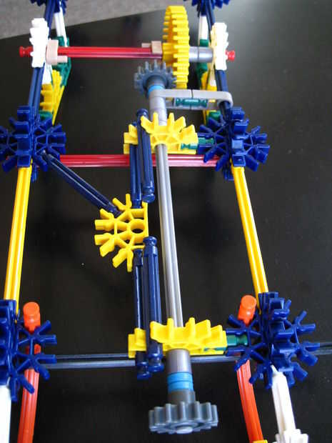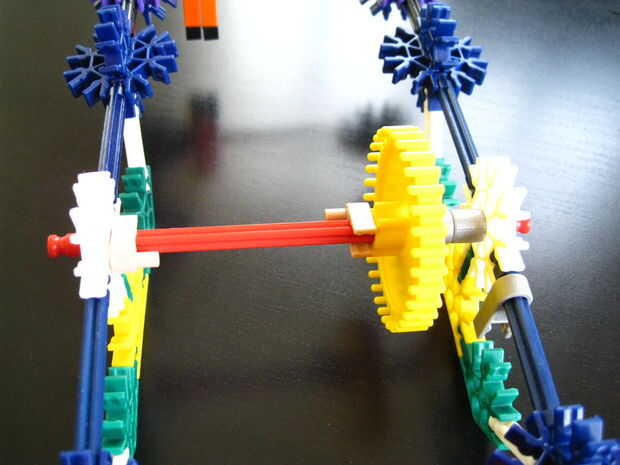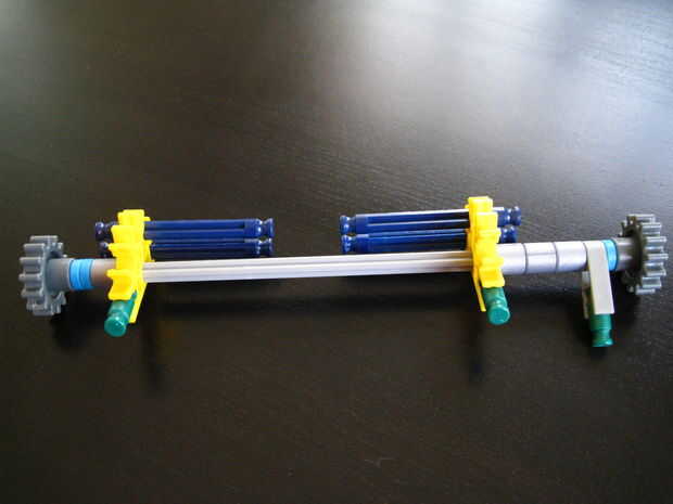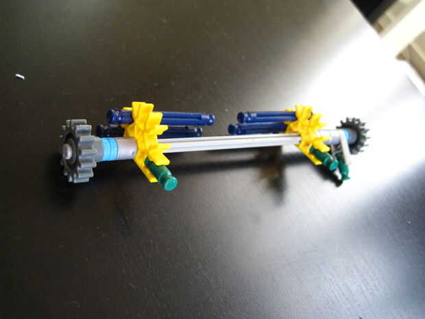 Esta es la parte trasera del chasis, vista desde arriba. Deslice una barra roja, dos separadores gris o el equivalente y un engranaje amarillo orientado como se muestra a través del conector blanco en el lado izquierdo del chasis. Continúe deslizando a través de otro conector y luego usar dos pequeños conectores para evitar deslizamiento. He utilizado tan seguros. Tenga en cuenta sin embargo, que el equipo amarillo no necesita ser bloqueado en la barra roja, pueden girar independientemente.