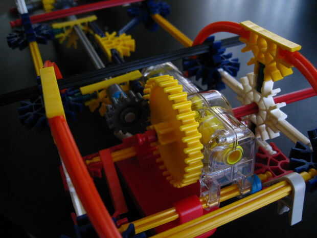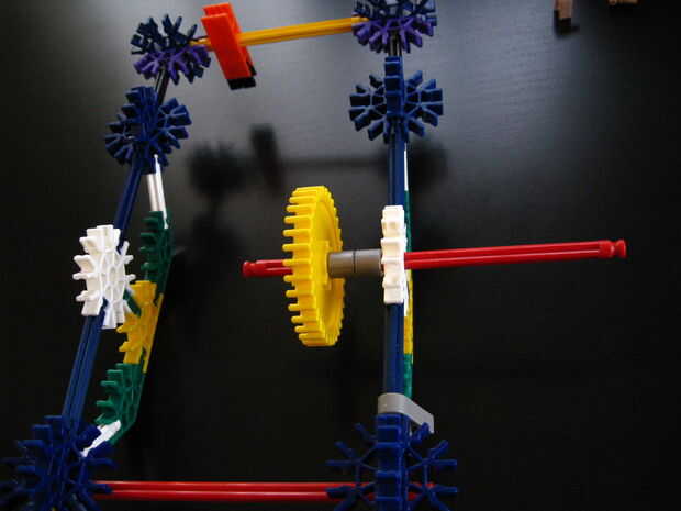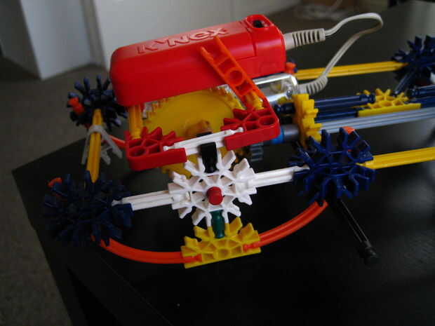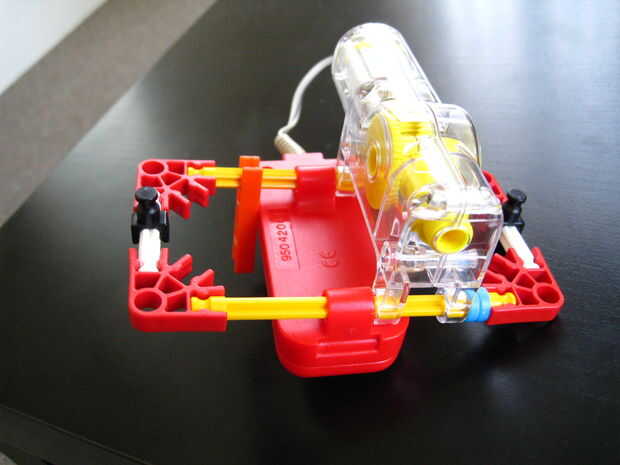 Voltee el chasis y deslice un conector rojo a través del conector blanco como se muestra, fuerza a través de la unidad de motor e inserte un engranaje amarillo junto a la unidad de motor. Mientras que haciendo esta línea hasta el agujero en el equipo amarillo con el orificio en la unidad de motor y acoplamiento con el equipo gris.