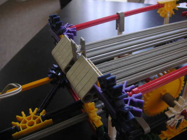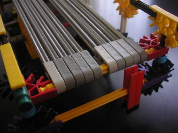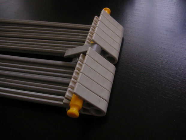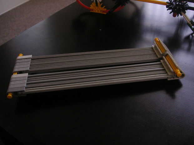 Fije 5 de las piezas hechas en foto 1 en una varilla amarilla, deslice un conector gris (extremo de una barra) sobre él y luego las otras 5.