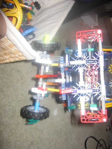 esto es una 4wd K'nex carro con puertas funcionales, un portón, acceso de baterías bajo el capó motor, un volante (dummy), cambio de marchas (dummy), asientos, llanta de repuesto y una cama. El sistema 4wd es rápidamente configurable para la impulsió