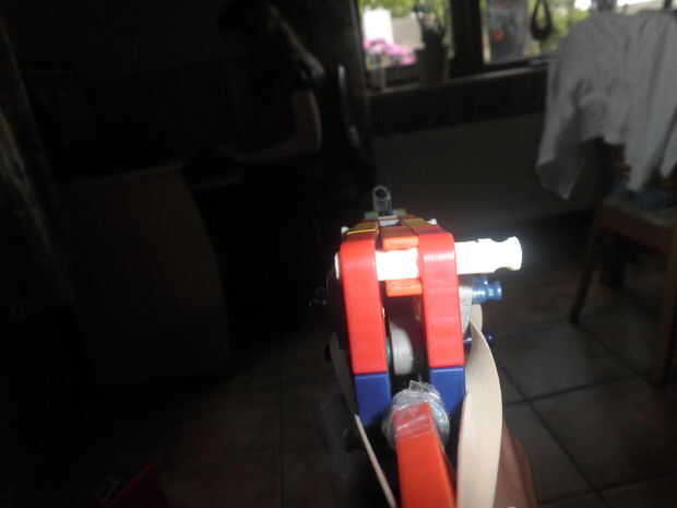 Hi es el sniper que he estado trabajando los últimos días. Si consigo algunos buenos comentarios que podría publicar un instructable. Tiene un mag horizontal, las balas Haz tiradas a lo largo de la revista por el pedazo de cuerda blanca. Una vez que