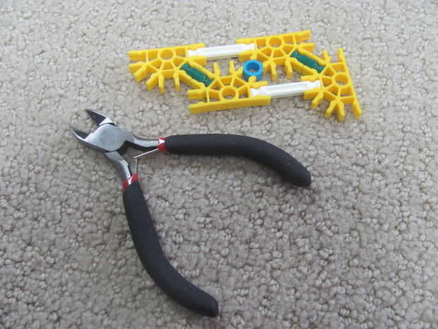 Esto es donde usted necesitará algunos buenos cortadores. Usted tendrá que modificar dos carpinteros amarillo para que los pequeños separadores azules se ajusta perfectamente. Tiene que ser perfecto para que la hoja no salga de la articulación cuando se abre. Basta con mirar la foto para ver lo que me refiero.