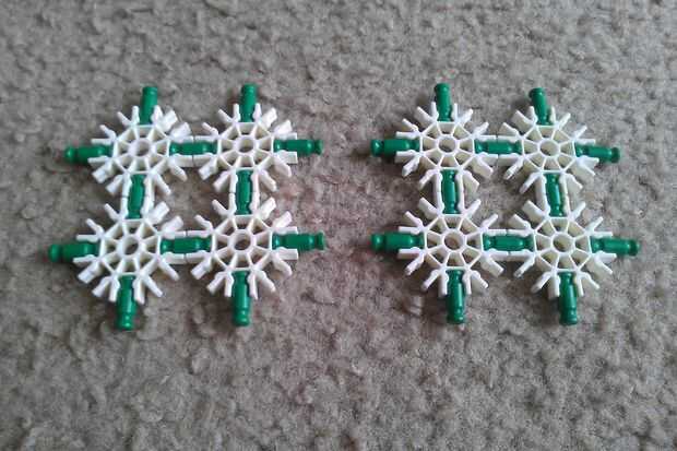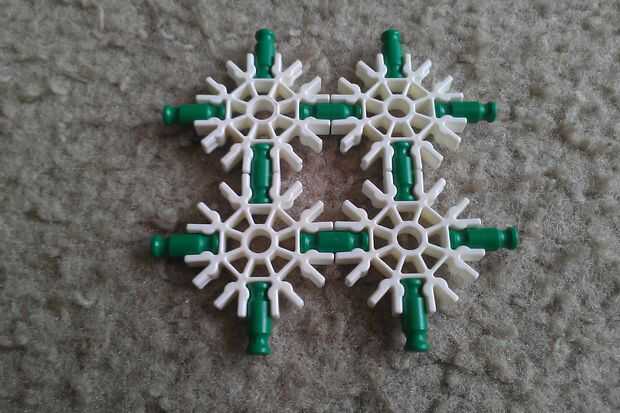 Tomar cuatro conectores blanco y conectar usando barras verdes. Añadir unas cuantas más barras verdes donde se muestra. Repita el procedimiento para obtener dos piezas.