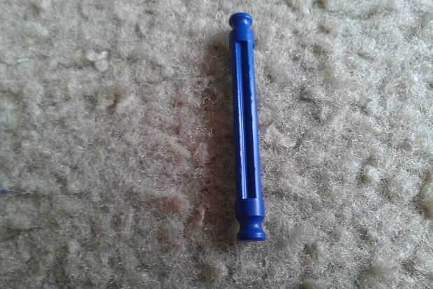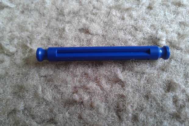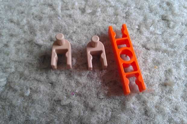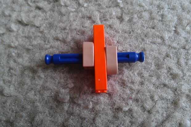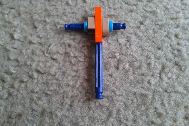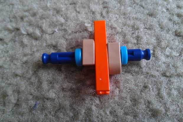 Tomar una barra azul y colocar dos bolsas de color beiges y un conector naranja. Asegúrese de que las cerraduras mantienen el conector naranja de rotación. Luego, añada dos separadores azul a cada extremo de la varilla. Por último, añadir una segunda barra azul a un extremo del conector naranja como se muestra.
