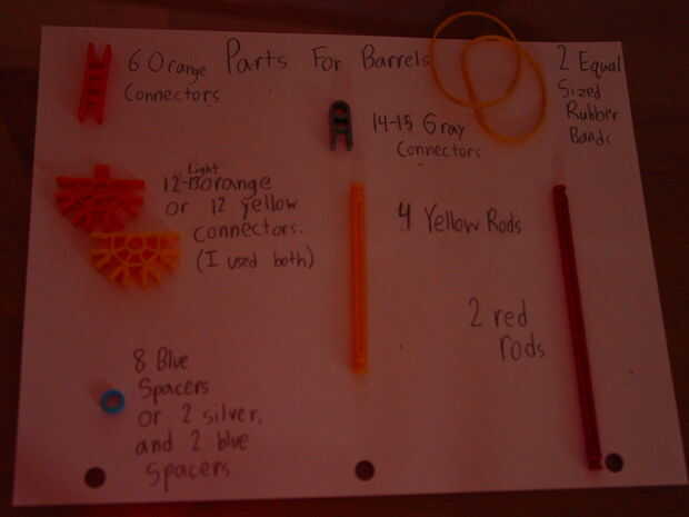 Paso 1: Construir los barriles Este paso es donde se construyen los barriles para el arma. Sólo tienes que seguir las imágenes, debería ser bastante fácil.Añadir un conector rojo a la mitad de los barriles, como se ve en las fotos.Paso 2: Construcció