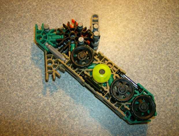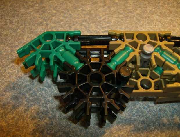 A k'nex gun shaped like the letter "S". O 5. Se hizo porque echaba de menos entrar en el torneo de Jollex y decidió publicar un arma basado en los requisitos del concurso, una pistola con gatillo complejo con partes móviles. Tiene un conector gr