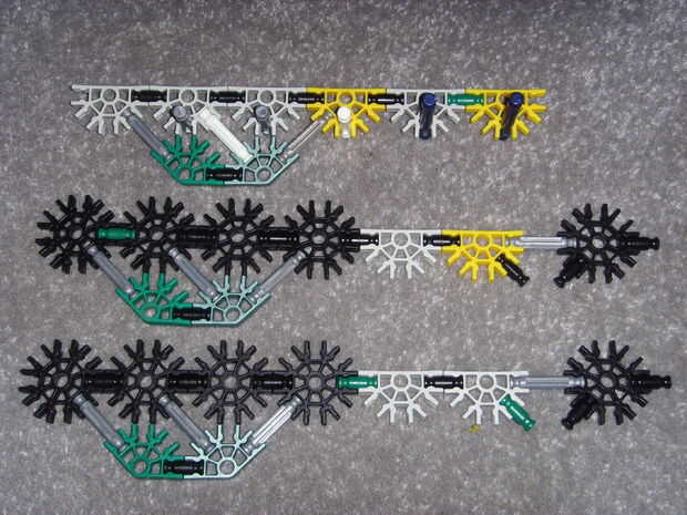 este es mi primer Instructable, dime si te gusta. Después de uso extenso de la barra principal gris las curvas, así que puede que tenga que reemplazarlo o puede utilizar una barra negra en su lugar.Barras:4 amarillos1 gris10 blues18 greens pequeños9