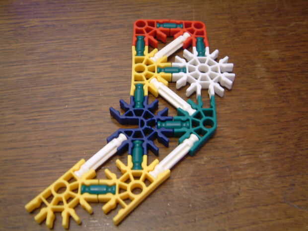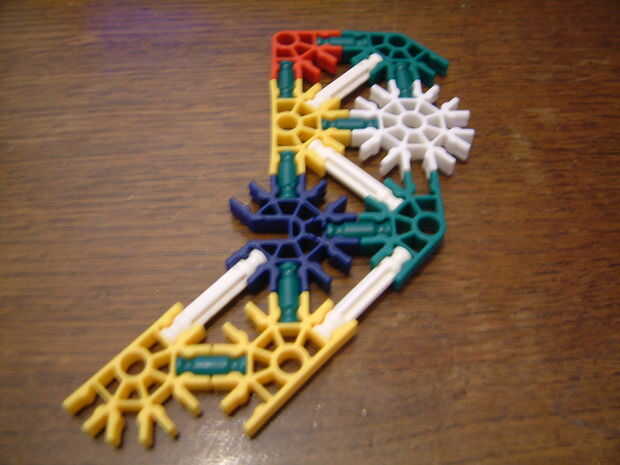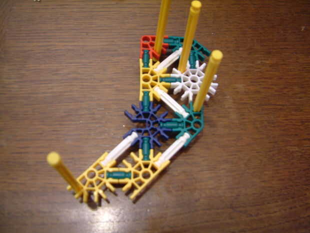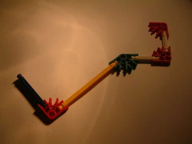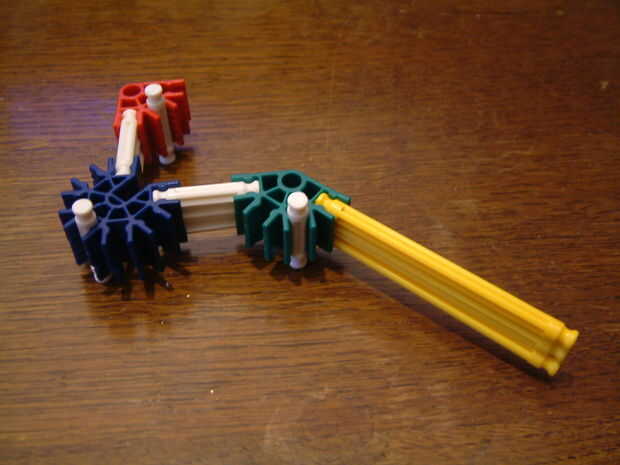 esto es un arma de gatling de K'nex mano que dispara barras amarillo casi 10 pies (que es cm 284 personas en Reino Unido)Es fácil de hacer y utilizar.Mis bandas tiraron las cañas muy duro y rápido, para no apuntar a nadie!!Este es un problema con el