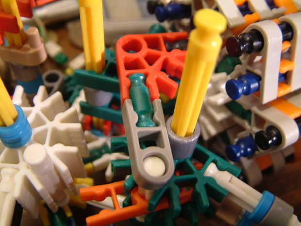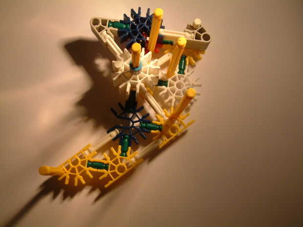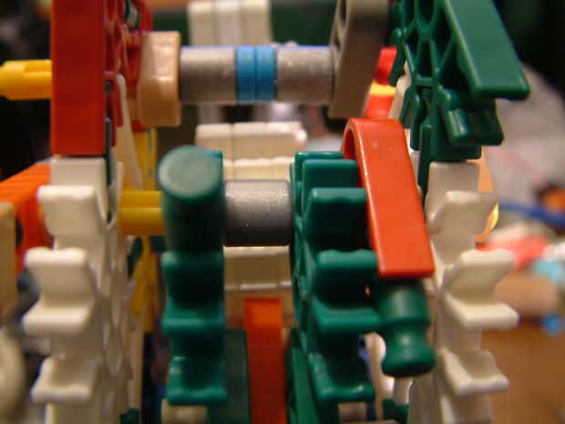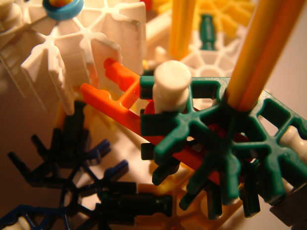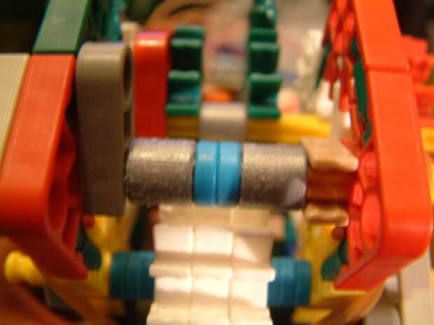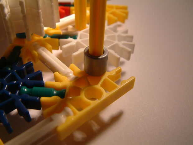 6. Agregue el grueso de 6 conectores espaciadores (12 blues, 4 plata) en la varilla amarilla por el martillo.