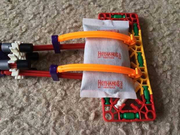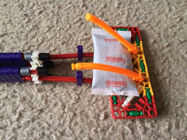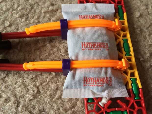 Instale dos conectores de lazo morado y dos conectores de diagonal "Y" a la cabeza del raspador, como se muestra. A continuación, coloque dos barras flexible naranja a los conectores "Y" diagonal. Luego, iniciar el calentador de la mano al exponerlo al aire y sacudiéndolo suavemente, luego deslice debajo de las barras flexible naranja. Por último, coloque la naranja flexible a través del lazo púrpura. Deslice los conectores lazo púrpura hasta seguro el calentador de la mano.