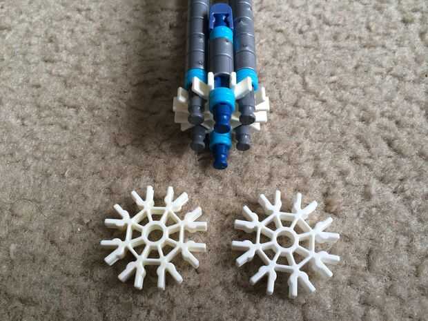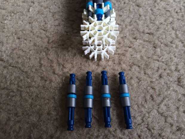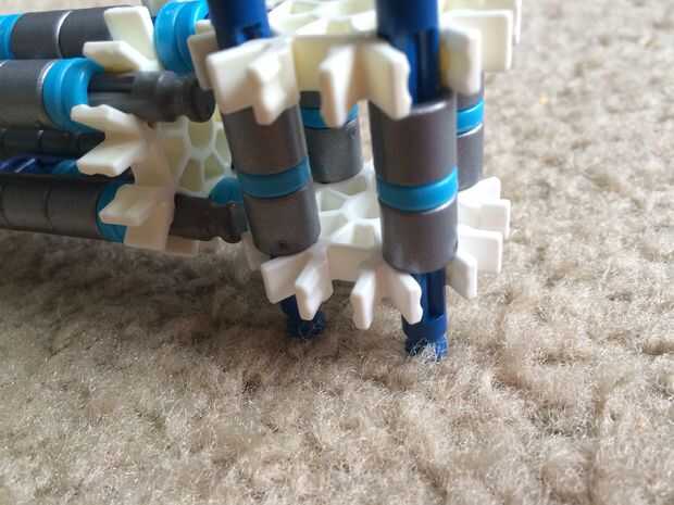 Conecte un conector blanco en la parte inferior de cada varilla azul. A continuación, coloque cuatro barras de azul, cada uno con dos separadores gris y un separador de agua azul, a cada conector blanco como se muestra.
