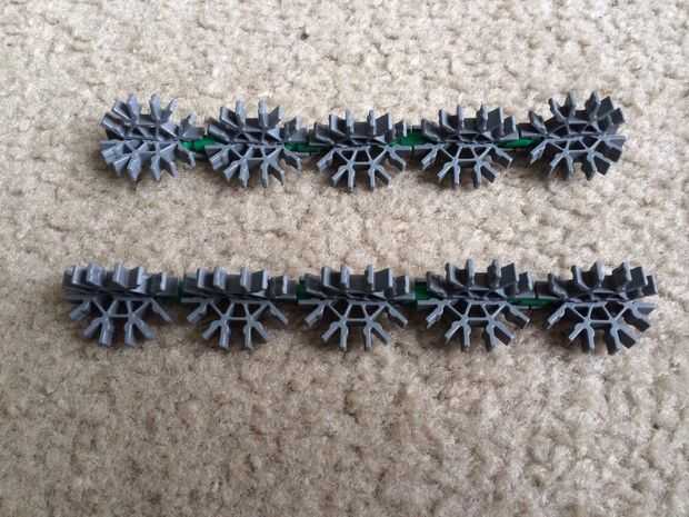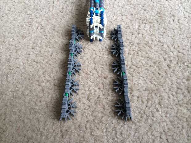 Take two grey connectors, and slide them together as shown. Repita el procedimiento para obtener diez piezas. Conecte las piezas en dos filas separadas de cinco con barras verdes y conectarse al punto de accesorio de pala en el pedazo de mango.