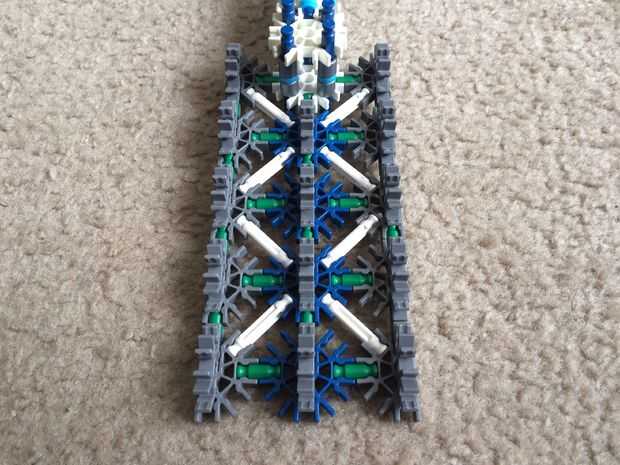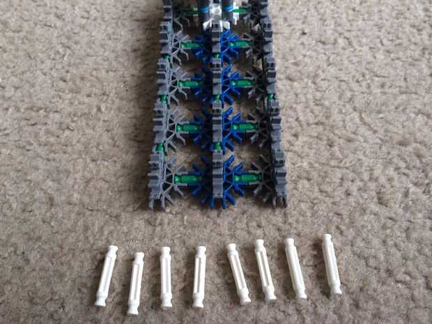 Un conector gris y un conector azul y deslícelos juntos como se muestra. Repetir para obtener cuatro pedazos y unirlos, utilizando barras verdes. Coloque en el centro del punto de accesorio de pala. Rellene todos los espacios con barras blancas.