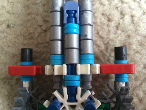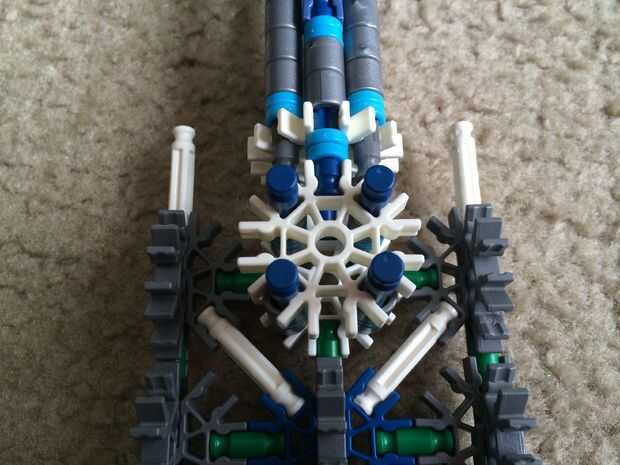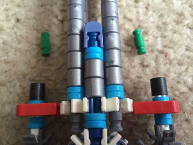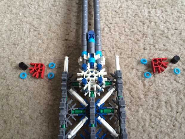 Coloque dos barras blancas en la parte superior de la ayuda de la pala. A continuación, Deslice dos separadores azules, un conector rojo, un separador más azul y una gorra negra. Conecte los conectores rojos en la parte inferior de la manija usando barras verdes.