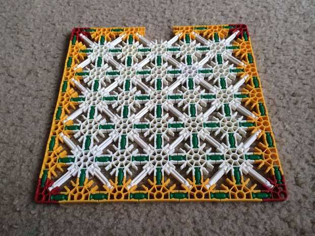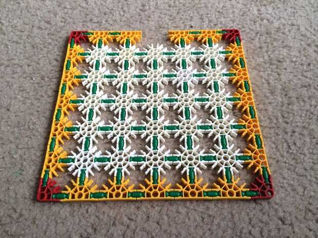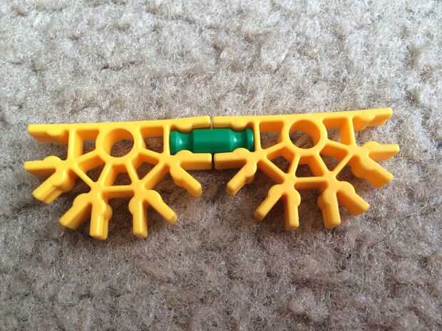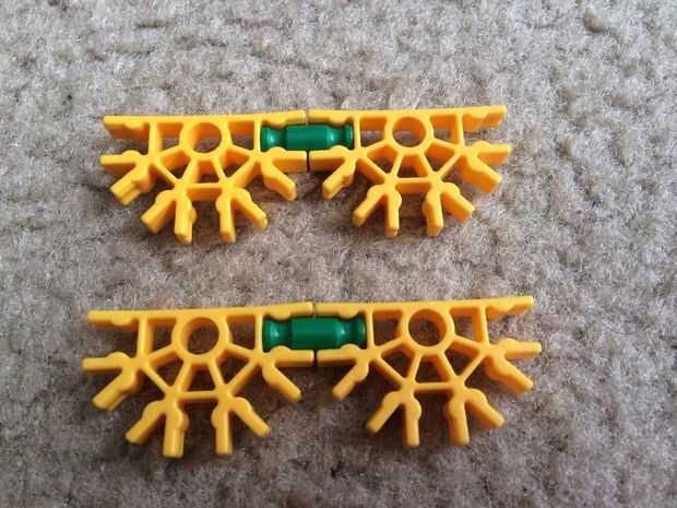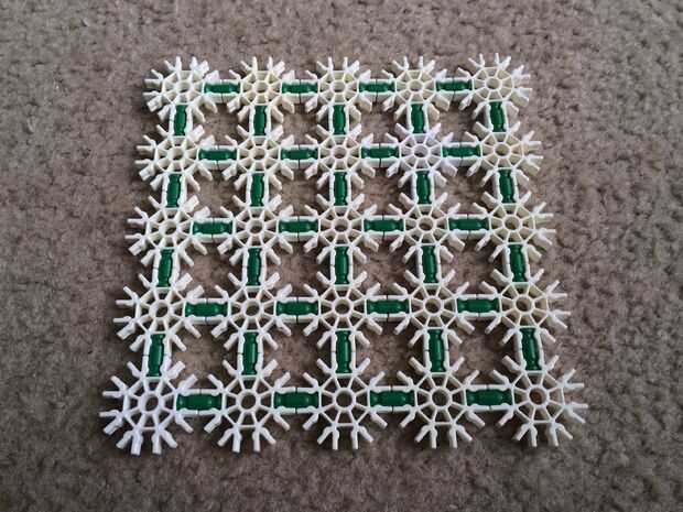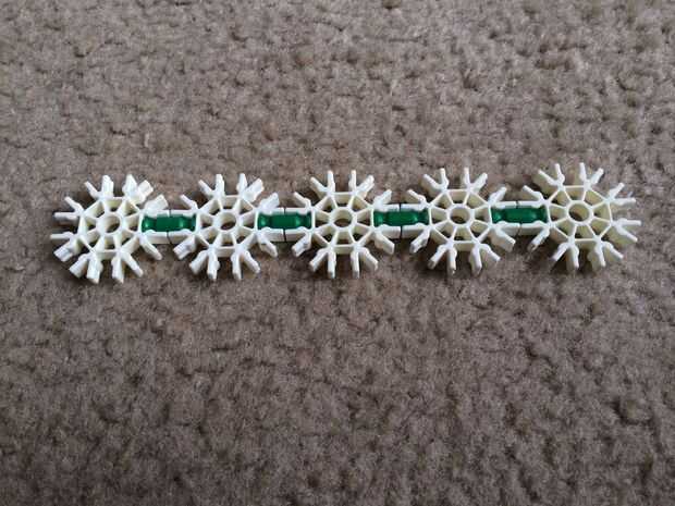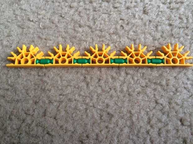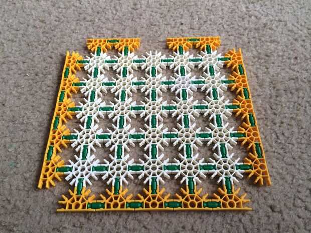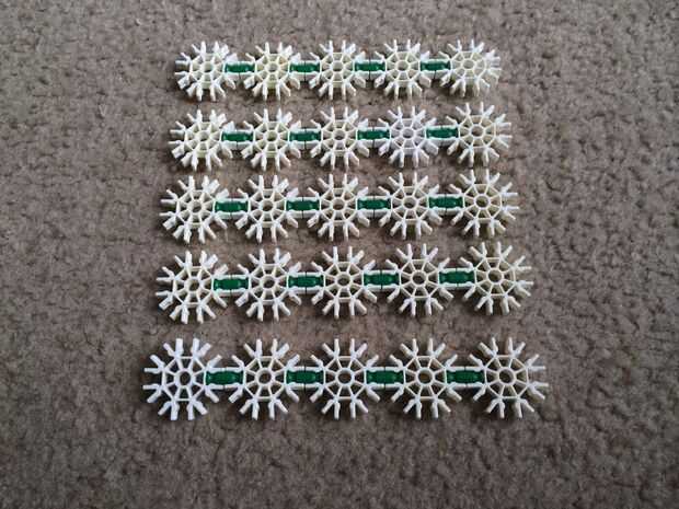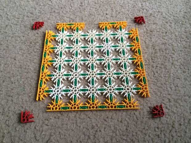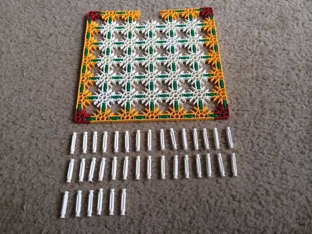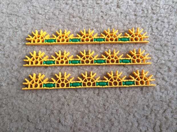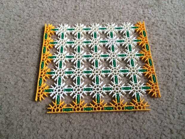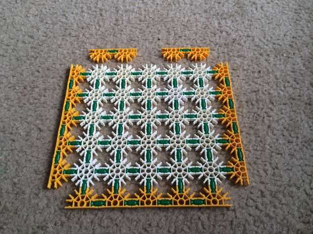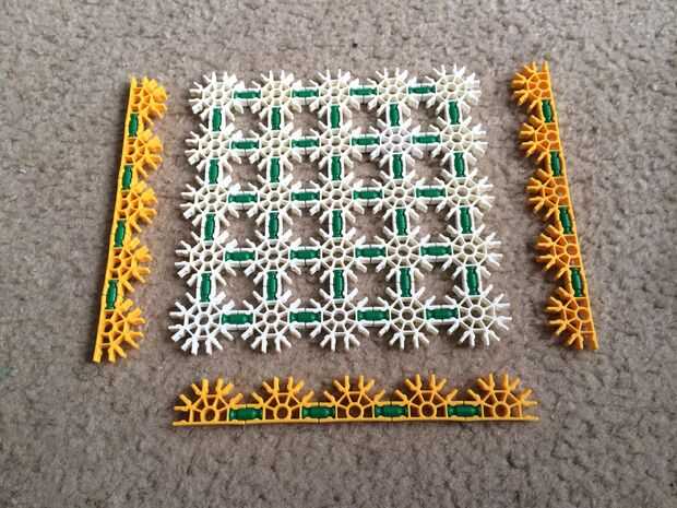 Take five white connectors and connect them using green rods. Repita el procedimiento para obtener cinco filas y conecte las filas utilizando barras verdes. A continuación, conecte cinco conectores amarillo usando barras verdes. Repita el procedimiento para obtener tres piezas. También hacer dos pares de conectores amarillos conectados.