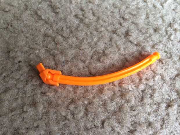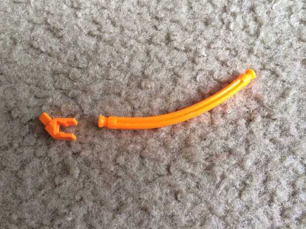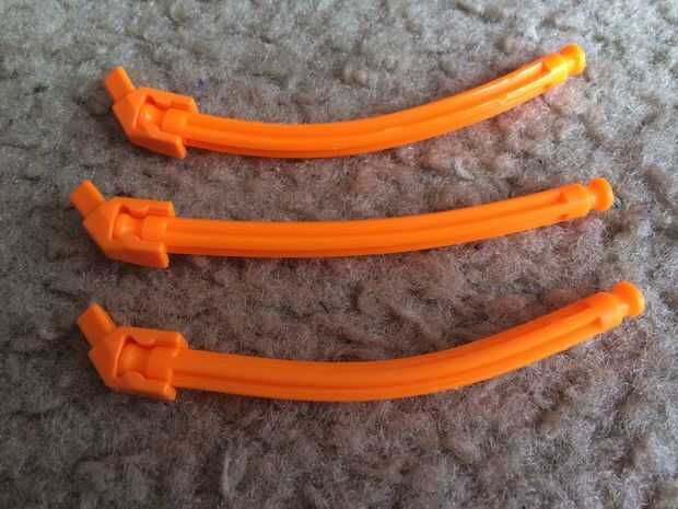 Conecte un conector en "Y" diagonal a cada una de sus cañas flexible naranja. A continuación, coloque cada pieza en la parte inferior de la parte posterior de la pala como se muestra. Asegúrese de que los conectores "Y" diagonal se insertan en los conectores amarillo en el extremo del panel de pala. Ahora estar doblado hacia adelante como se muestra el panel de la pala.