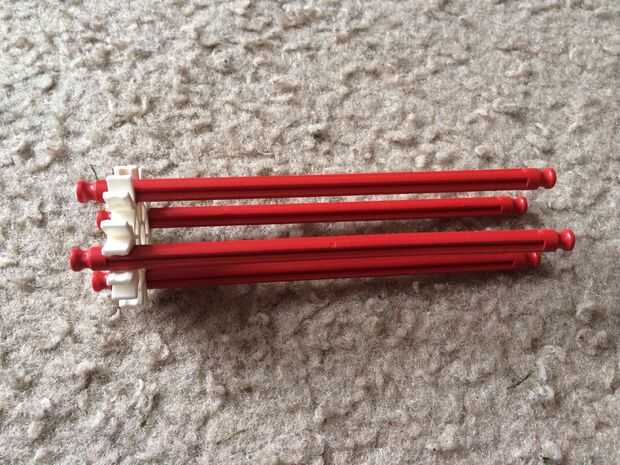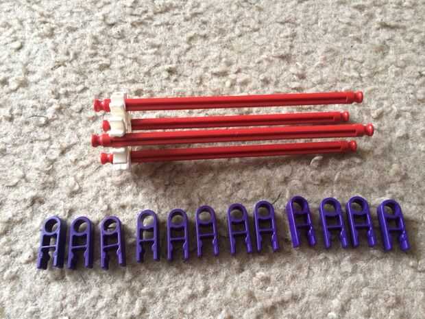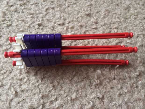 Tomar cuatro barras rojas y adjuntarlos a un conector blanco como se muestra. A continuación, deslice 6 conectores lazo púrpura en cada una de las dos varillas rojo superior.