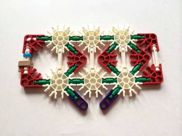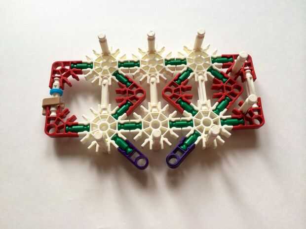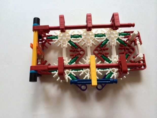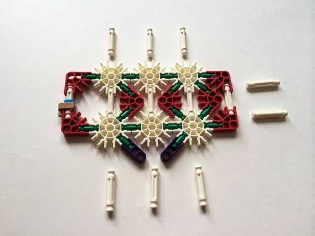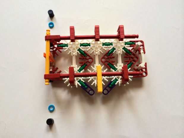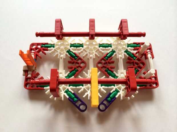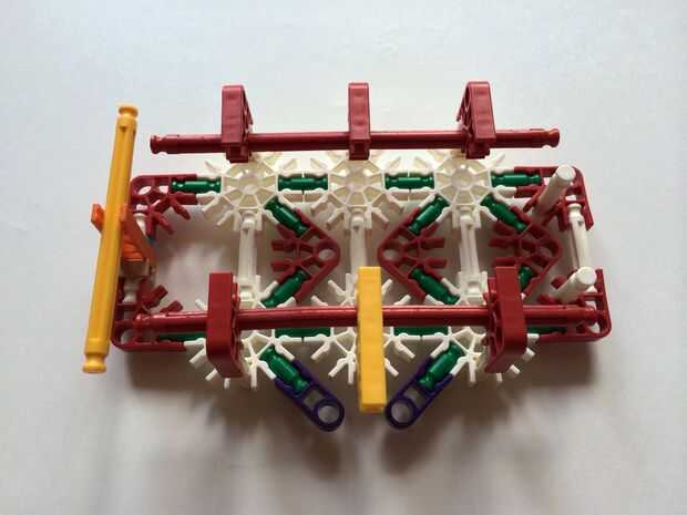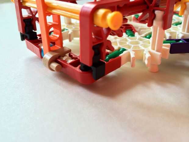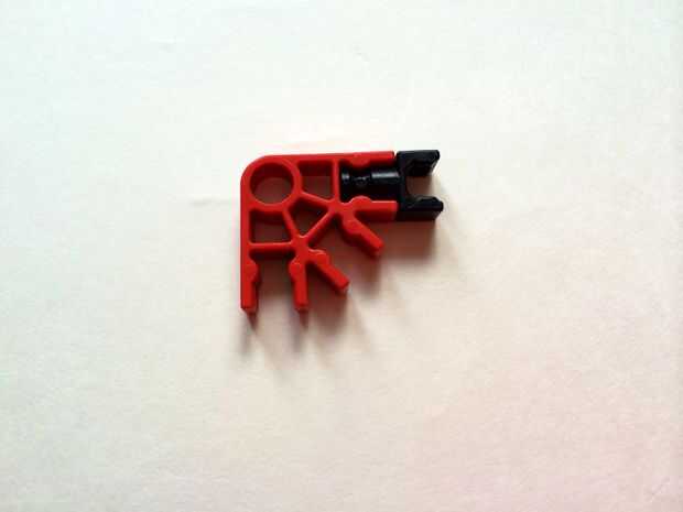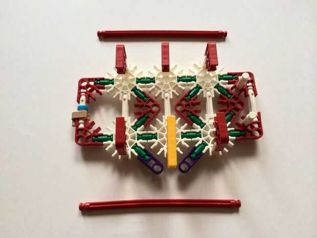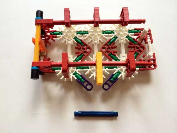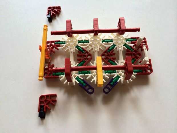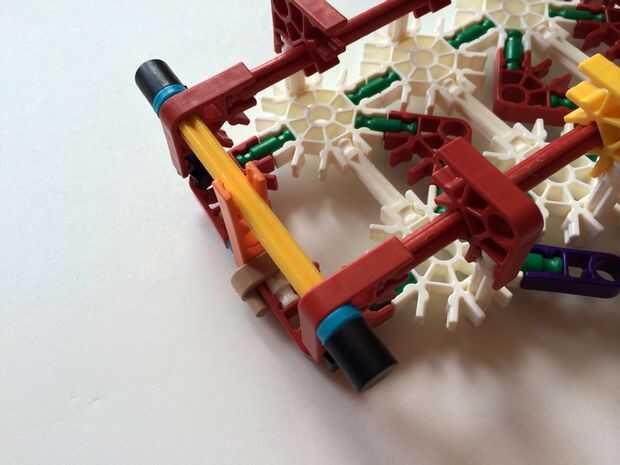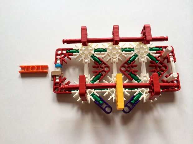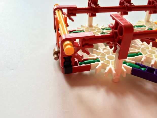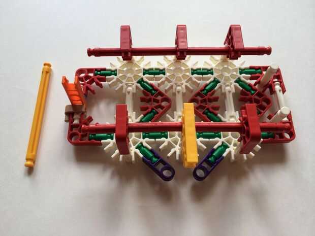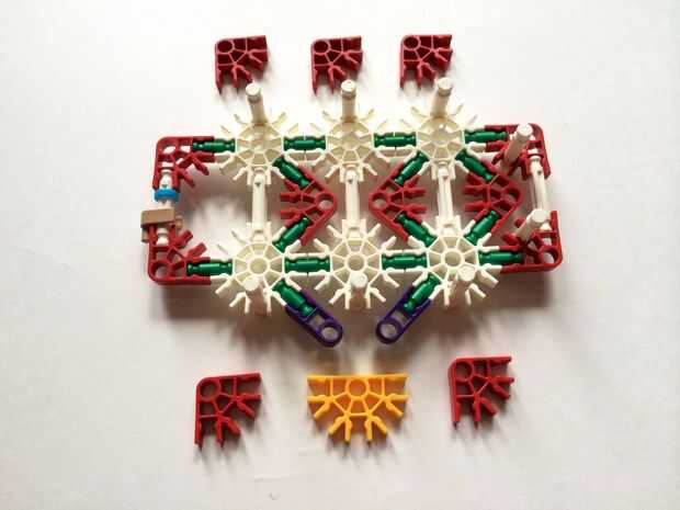 Empezar por desenganche la varilla del blanco en un extremo en el lado izquierdo de la caja del forro como en fotos 1 y 2. Luego, añada un bloqueo de la rotación tan y un separador azul como en fotos 3, 4 y 5. Entonces, añadir 8 varillas blancas como en cuadros 7, 8 y 9. Añadir 5 conectores rojo y un conector amarillo a la parte superior de todas las barras de blanco, como se muestra en fotos 10, 11 y 12. A continuación, agregue dos barras rojas como en fotos 13, 14 y 15. Añadir un conector naranja entre el separador de azul y tan bloqueo de rotación como en cuadros 16, 17 y 18. Añadir una barra amarilla en el conector naranja (fotos 19, 20 y 21).