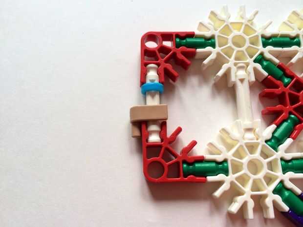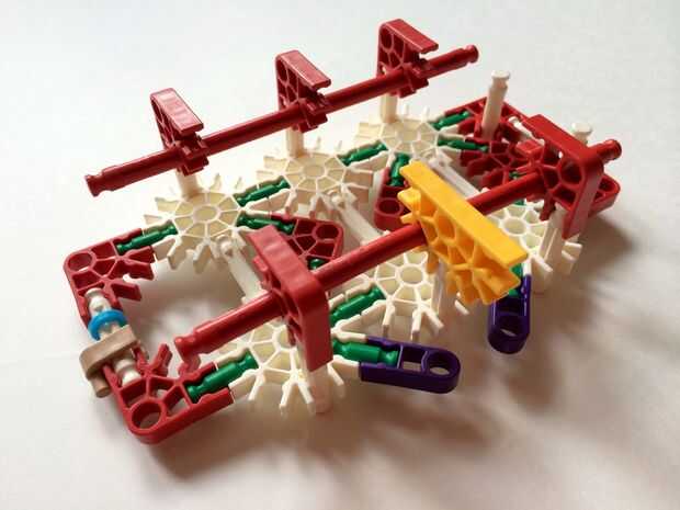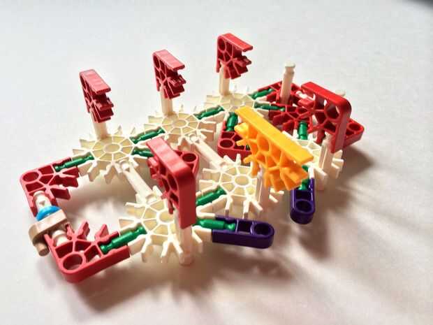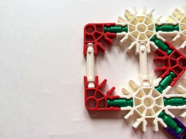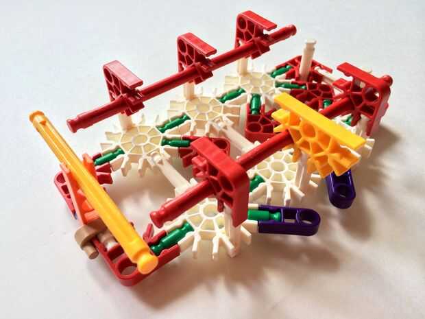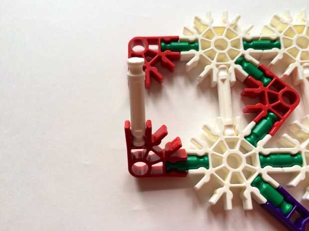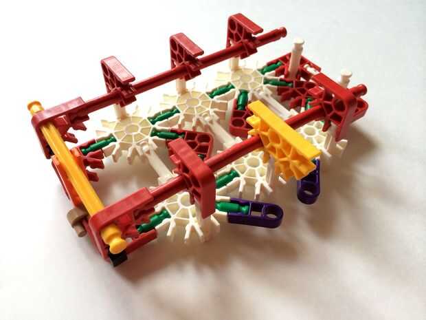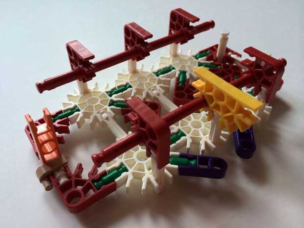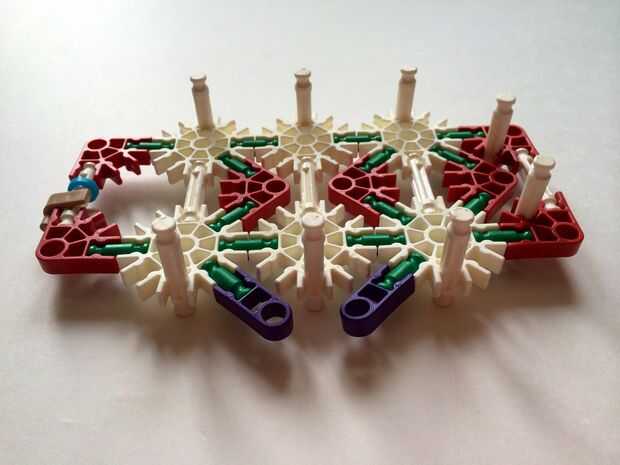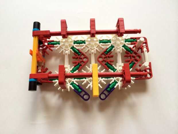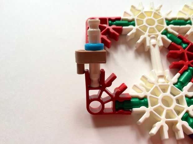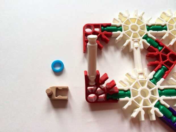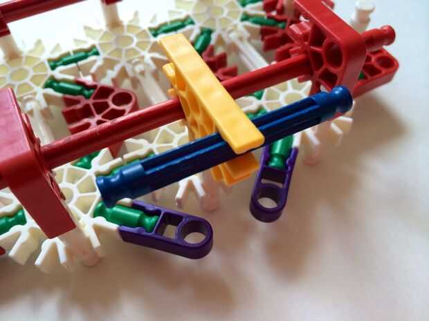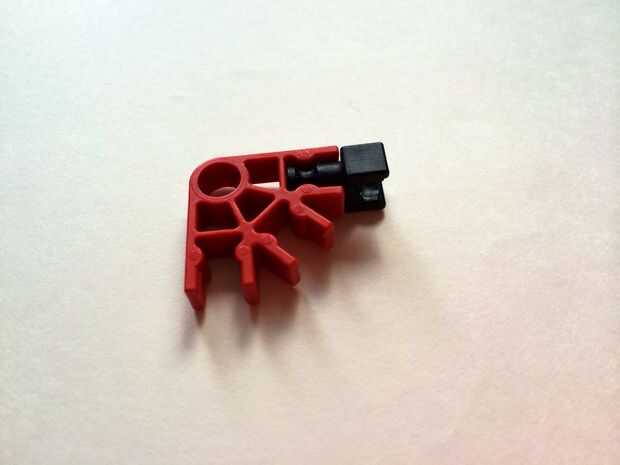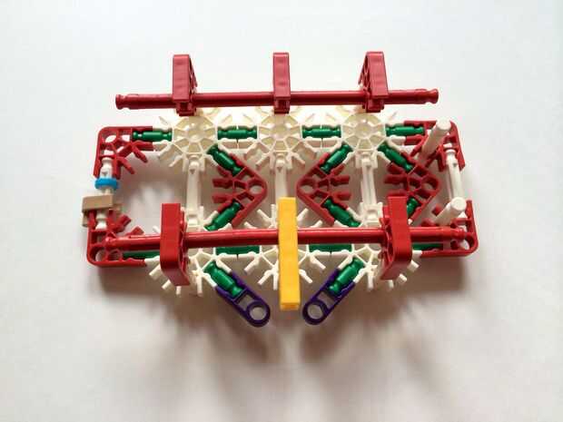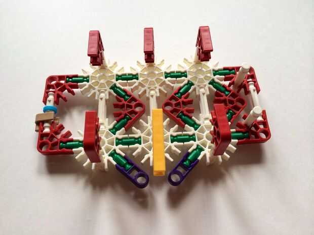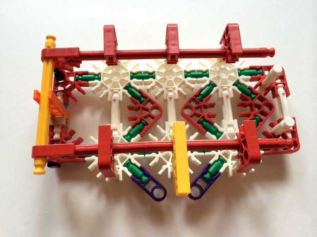 Empezar por desenganche la varilla del blanco en un extremo en el lado izquierdo de la caja del forro como en fotos 1 y 2. Luego, añada un bloqueo de la rotación tan y un separador azul como en fotos 3, 4 y 5. Entonces, añadir 8 varillas blancas como en cuadros 7, 8 y 9. Añadir 5 conectores rojo y un conector amarillo a la parte superior de todas las barras de blanco, como se muestra en fotos 10, 11 y 12. A continuación, agregue dos barras rojas como en fotos 13, 14 y 15. Añadir un conector naranja entre el separador de azul y tan bloqueo de rotación como en cuadros 16, 17 y 18. Añadir una barra amarilla en el conector naranja (fotos 19, 20 y 21).