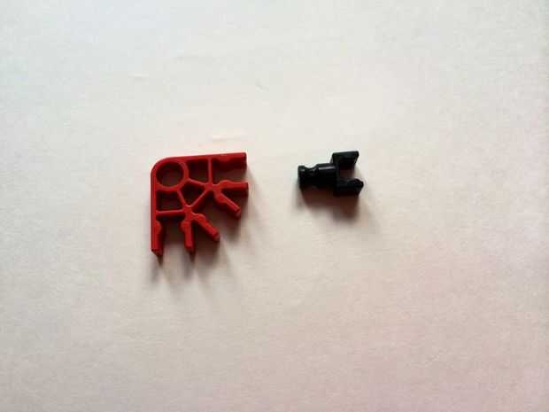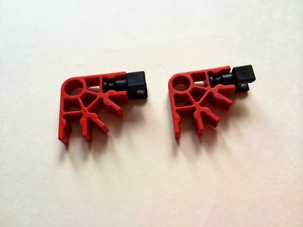 Añadir un conector en "Y" a un conector rojo como se muestra en los cuadros 22 y 23 y rotar de 90 ° como se muestra en imagen 24. Repita el procedimiento para hacer dos piezas total. Añadir las piezas a los extremos izquierdos de las barras del rojo como se muestra en fotos 26, 27, 28, 29 y 30. Añadir un separador azul y una gorra negra en cada extremo de la barra amarilla, como se muestra en fotos 31, 32 y 33. Por último, añadir una barra azul en la parte inferior del conector amarillo como en cuadros 34, 35 y 36.