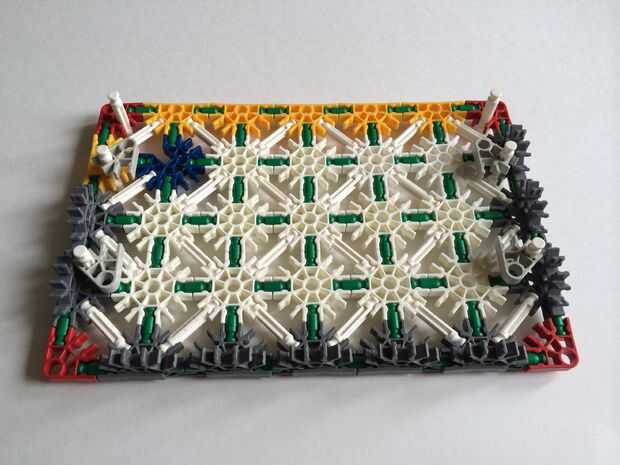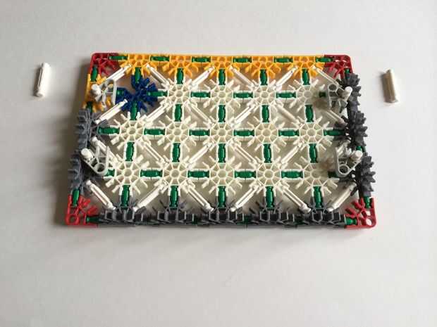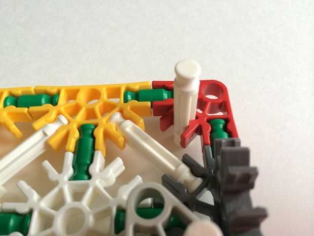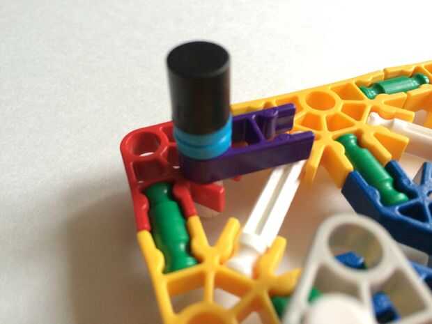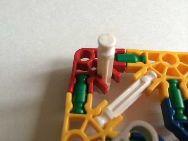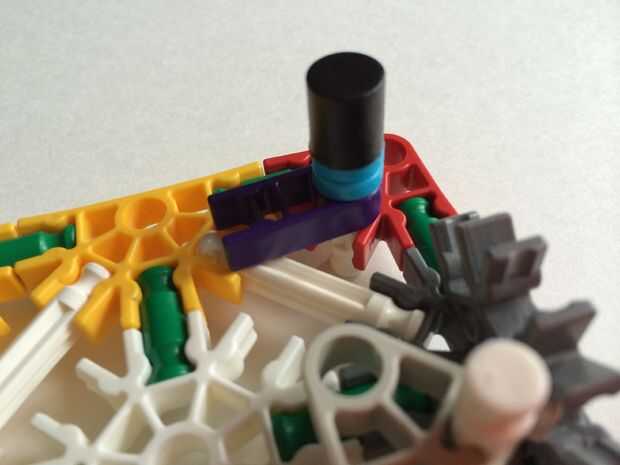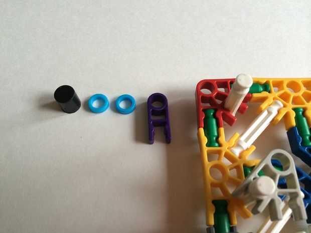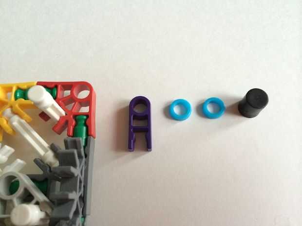A continuación, deslice un conector de lazo púrpura, dos separadores de azul y una gorra negra en cada varilla blanca.